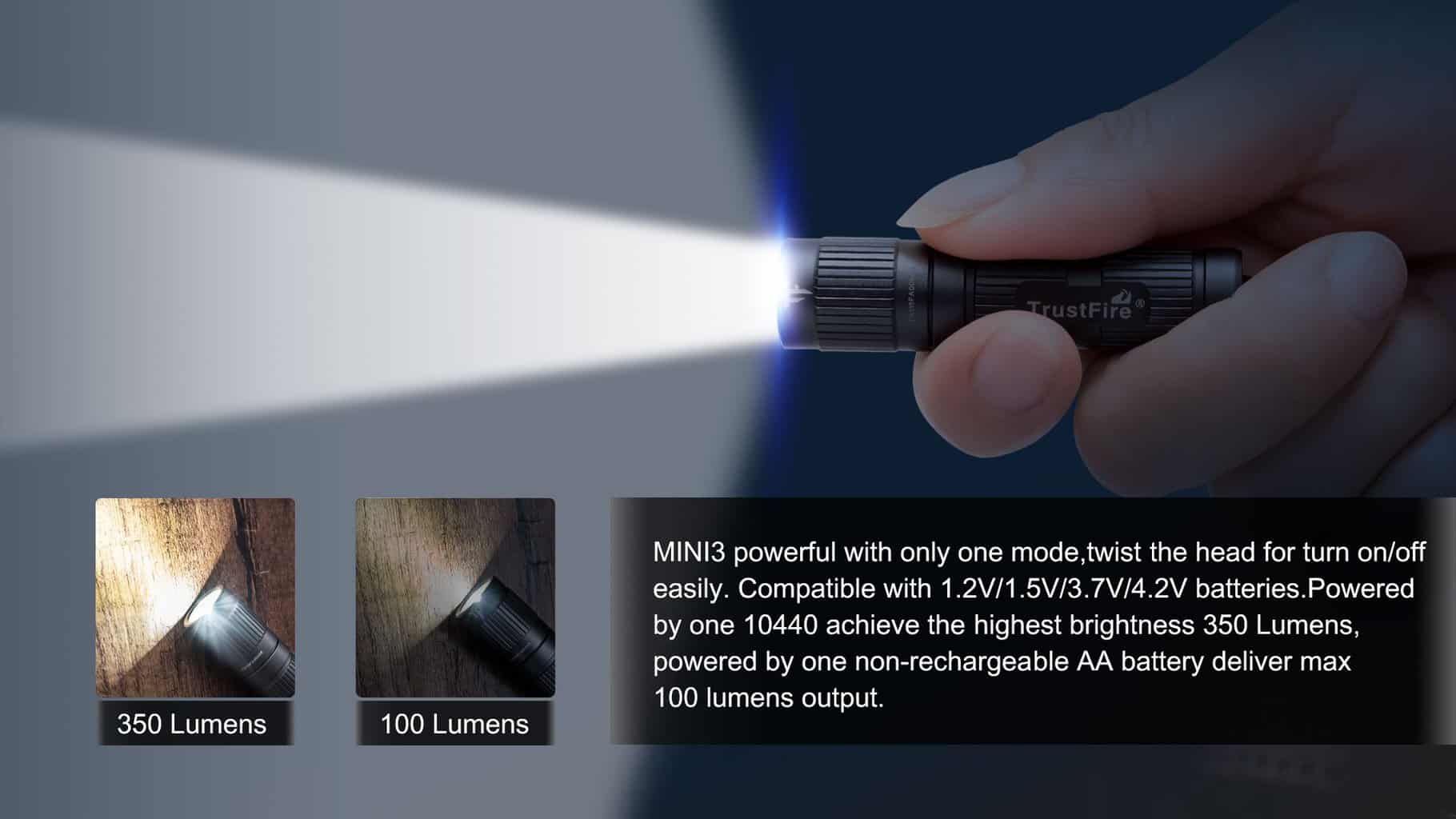 The MINI3 is a tiny keychain EDC light with wide voltage design which could be powered by 10440 600mah or AAA battery (NiMH or alkaline) 1.2V/ 1.5V/ 3.6V/ 3.7V/ 4.2V and dual output settings ranging from 100 to 350 lumens. There is just one mode for MINI3 keychain light, twist the head for turn on/off.