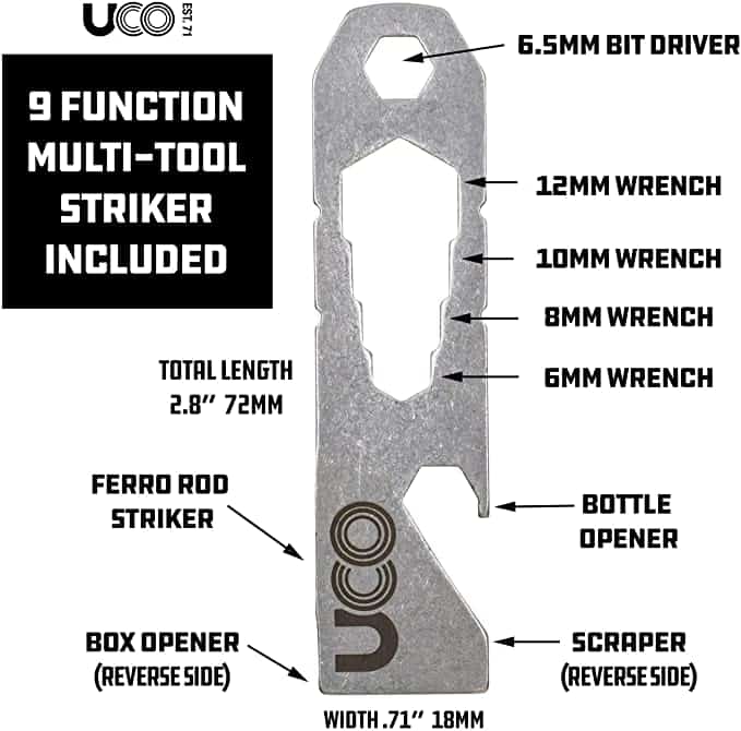 It also comes with a stainless steel striker which also is a multifunctional survival tool with 8 functions. Functions include screwdriver, bottle opener, 4 hex sizes and striker.